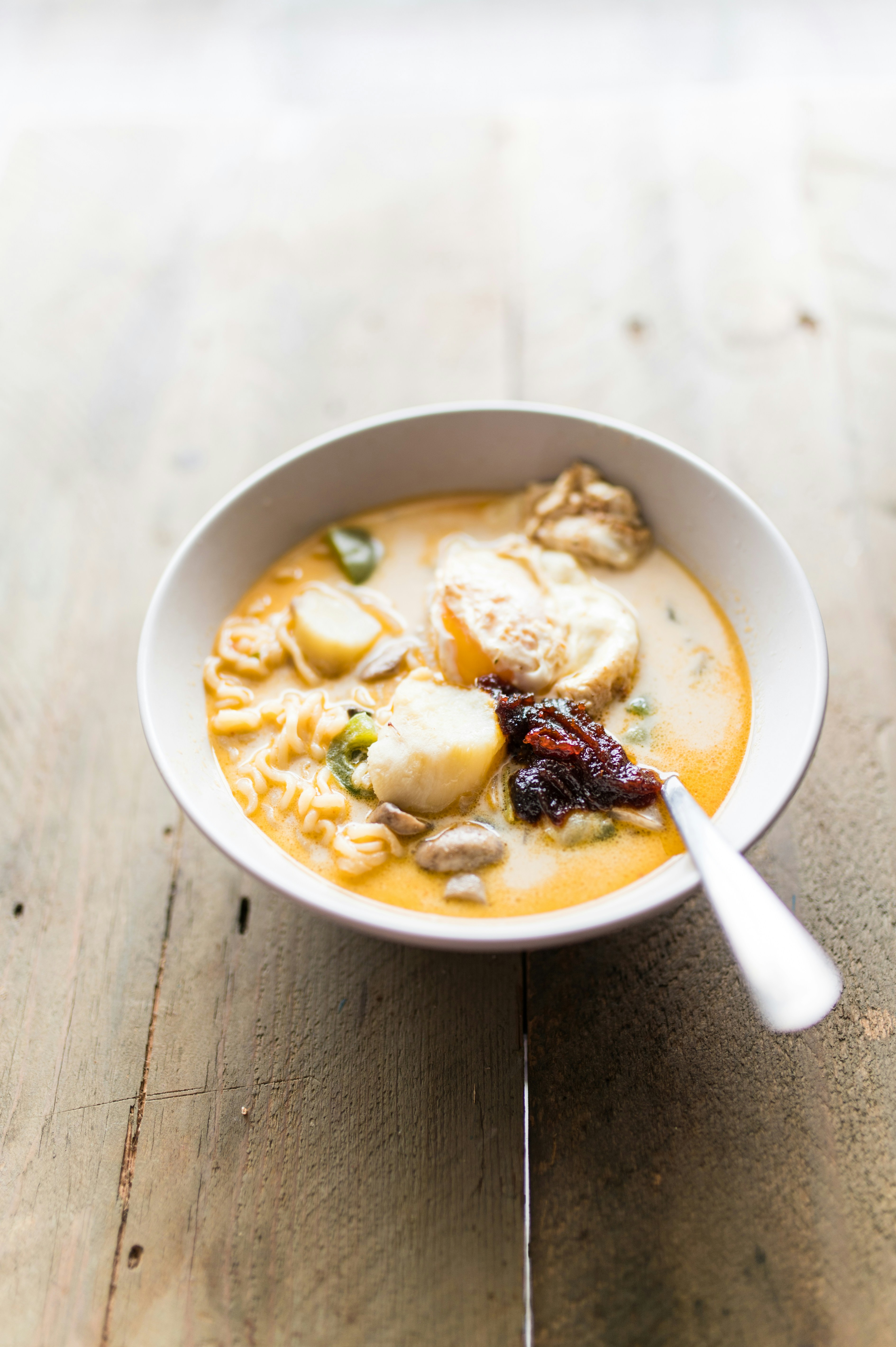 a bowl of soup on a wooden table