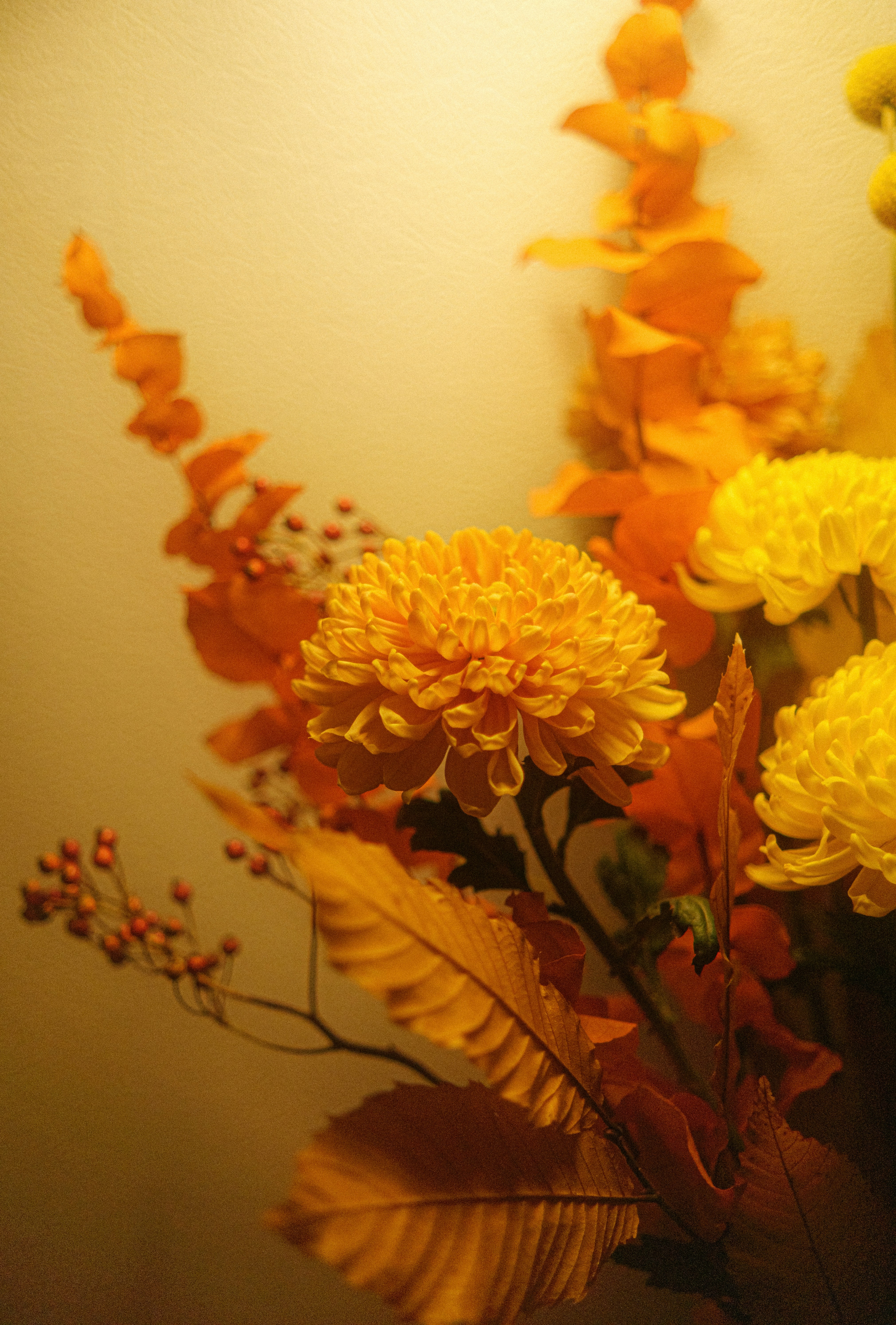 A vase filled with yellow and orange flowers