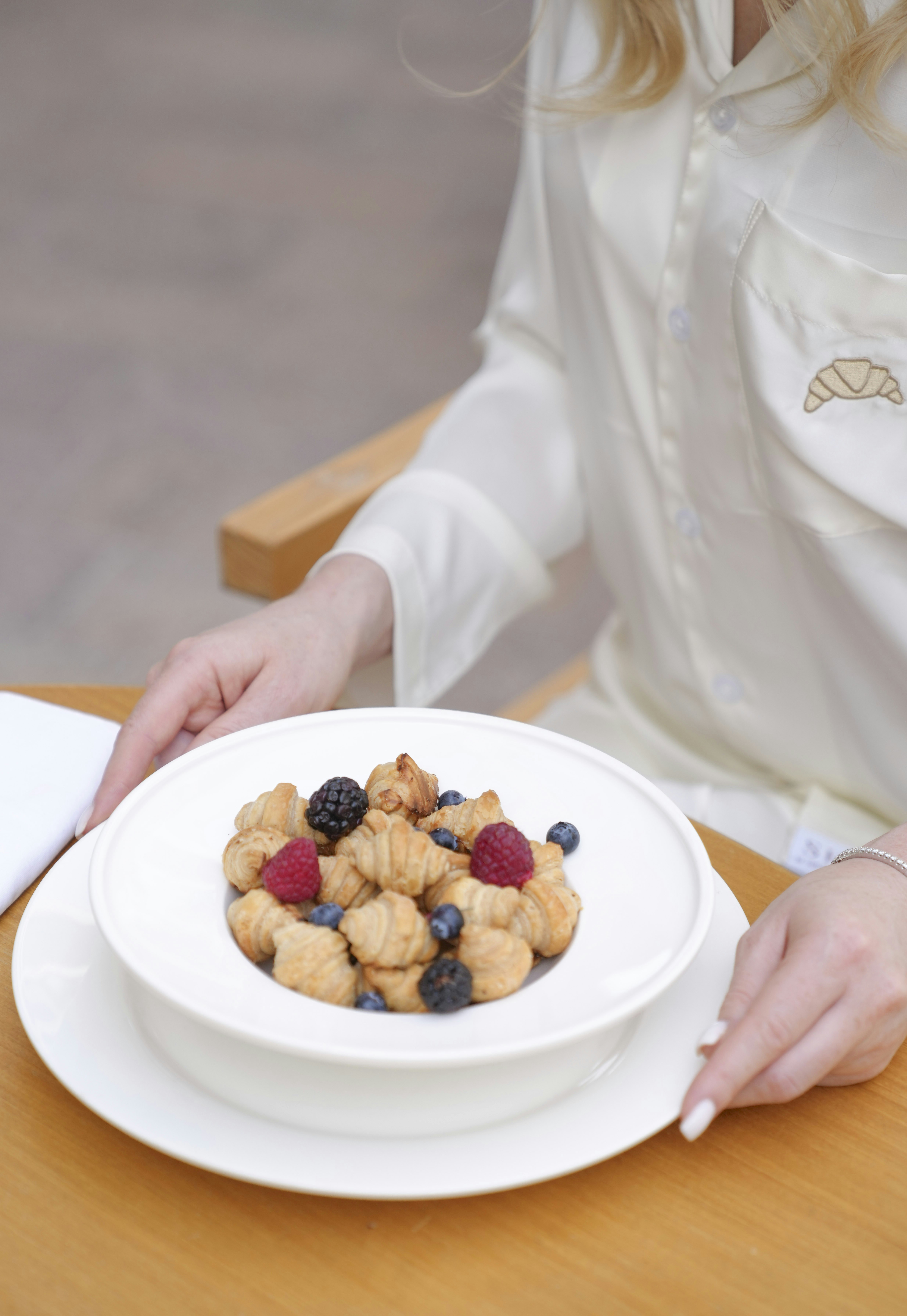 A woman sitting at a table with a plate of food