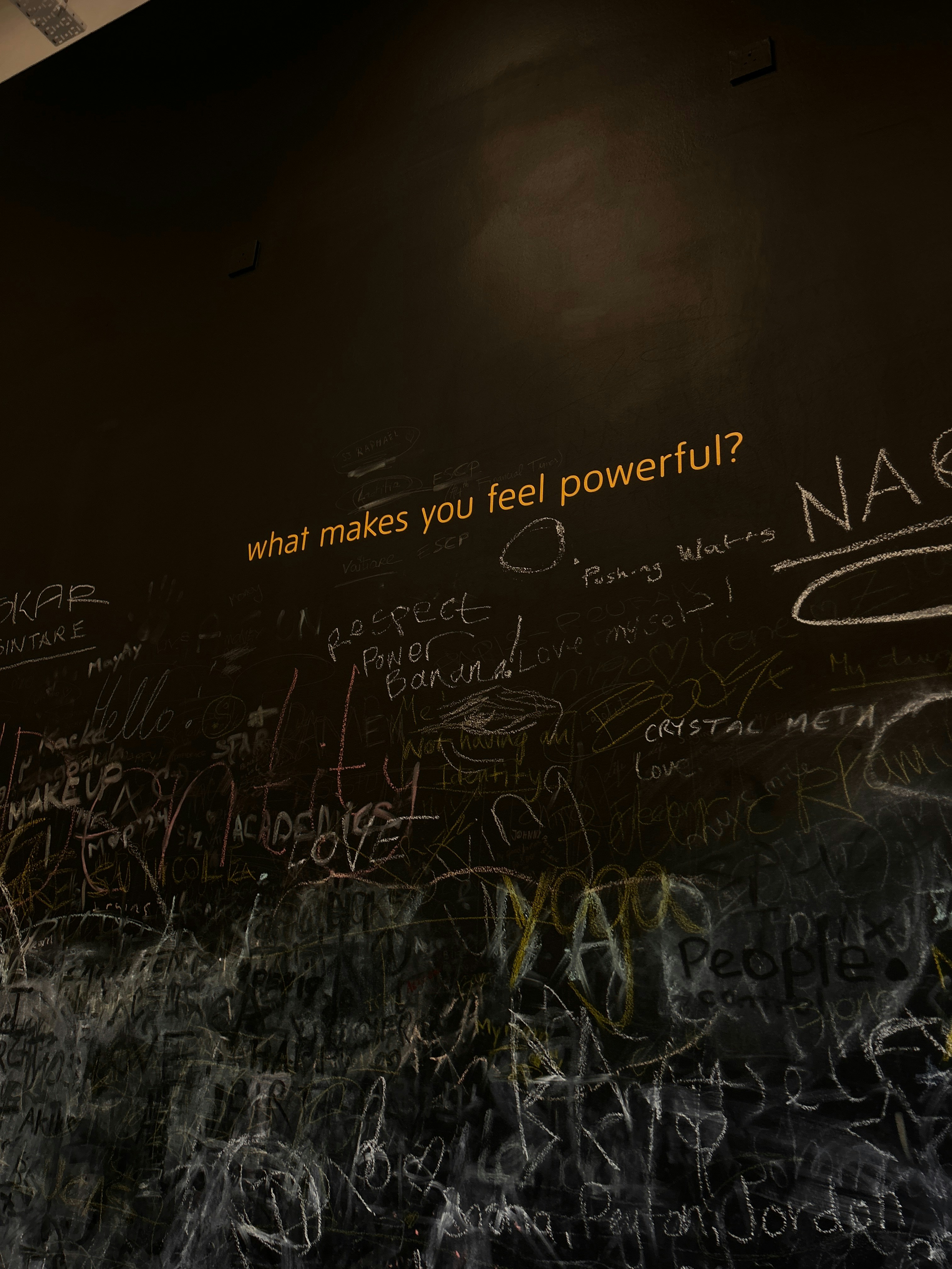A wall covered in graffiti and writing on it