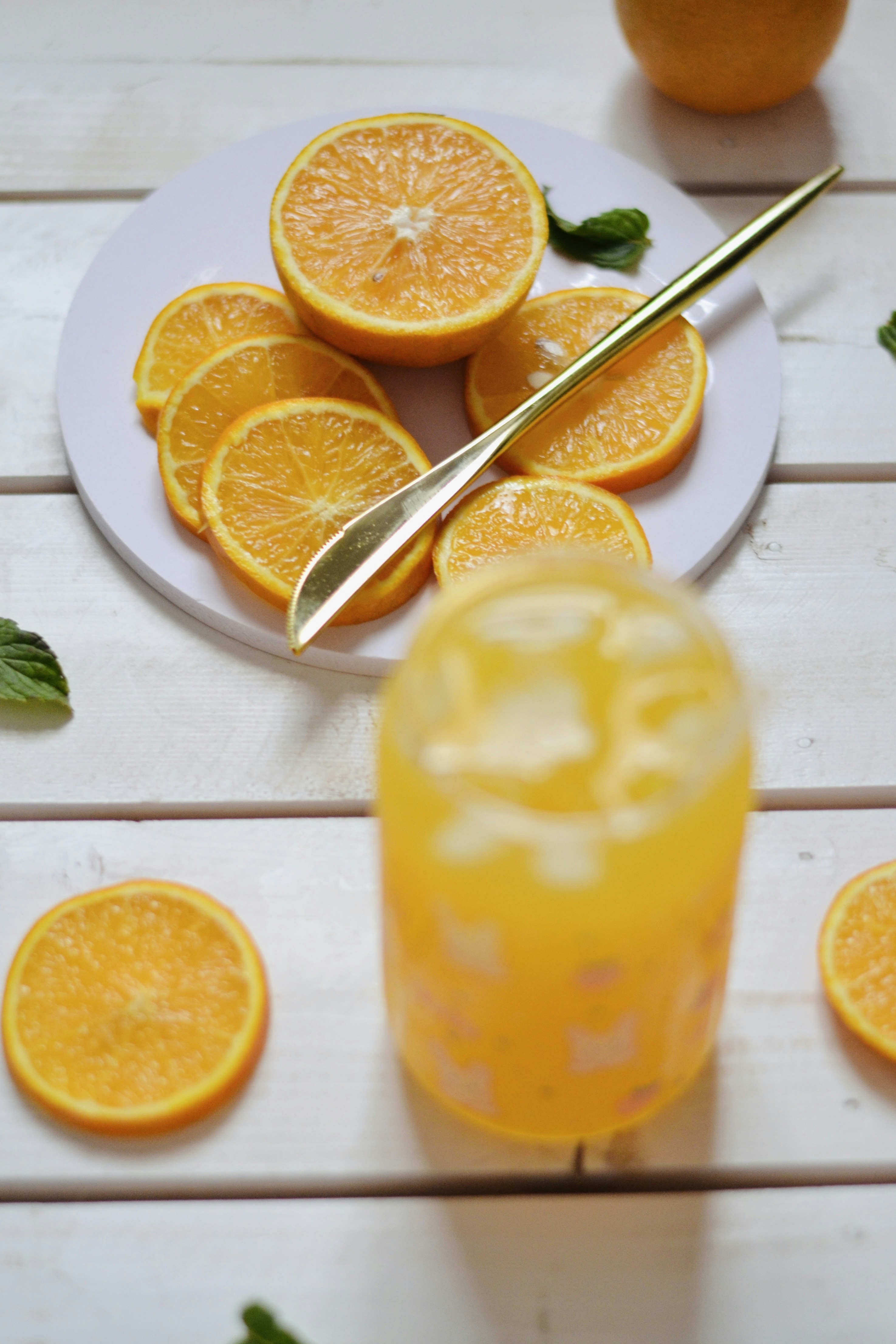 A plate of orange slices and a glass of orange juice