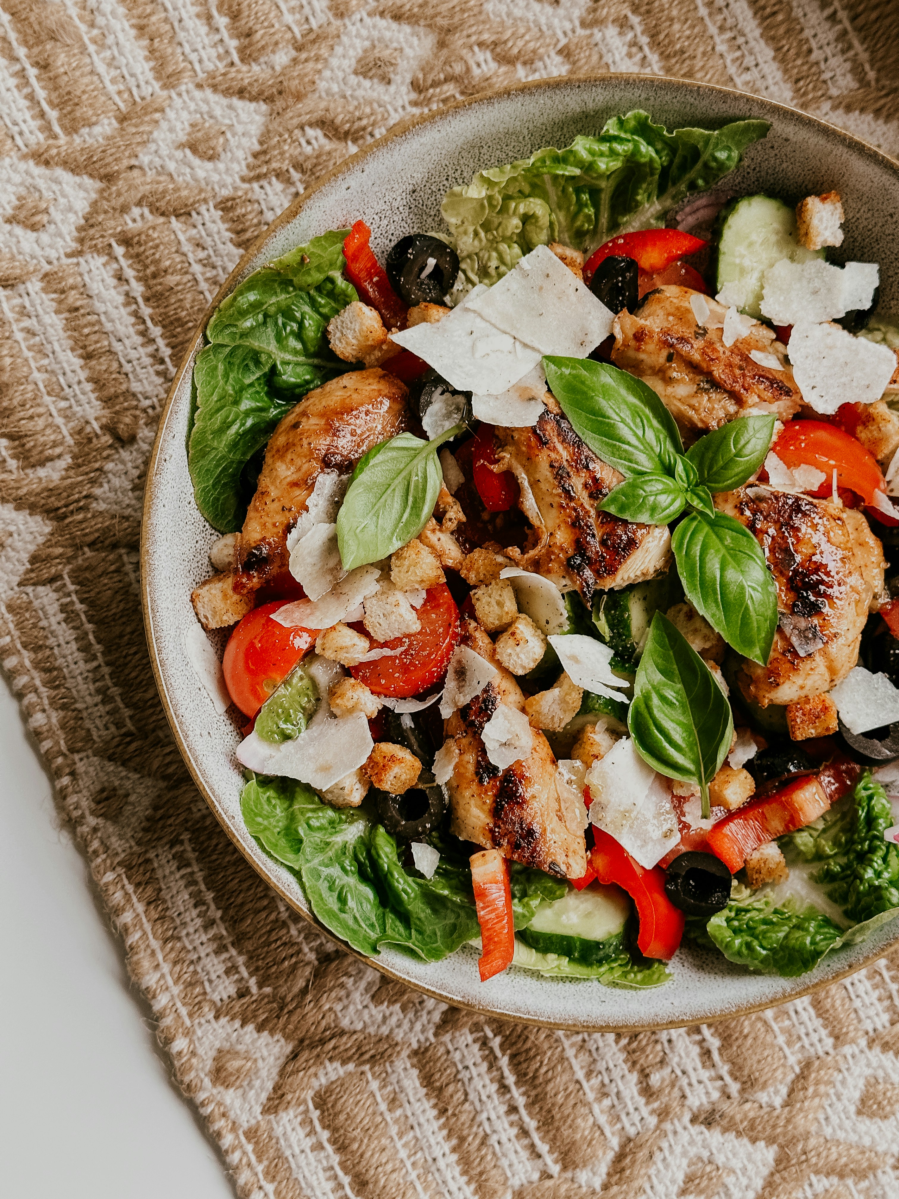 a salad with chicken, tomatoes, lettuce, olives, and cheese