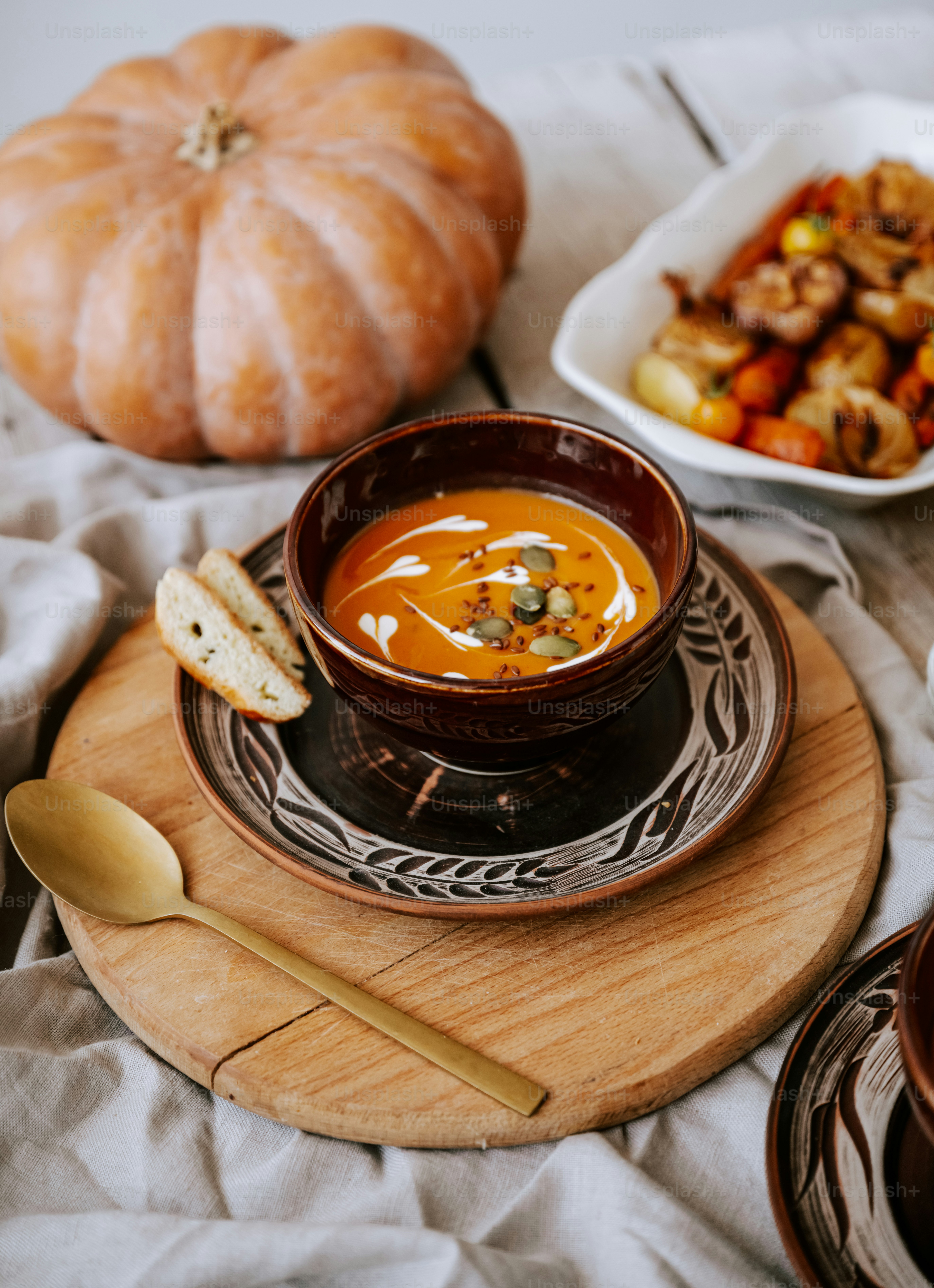 A bowl of soup sits on a plate next to other dishes